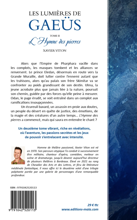 Homme de théâtre passionné, Xavier Viton est né en 1970. Son parcours atypique l’a conduit à successivement être militaire, chanteur d’opéra, comédien, metteur en scène et dramaturge, jusqu’à devenir aujourd’hui directeur de plusieurs théâtres à Bordeaux. Élevé en 2021 au rang de Chevalier des Arts et des Lettres, et féru de littérature médiévale fantastique, il nous offre ici le deuxième volet d’une trilogie palpitante portée par une galerie de personnages d’une remarquable profondeur.