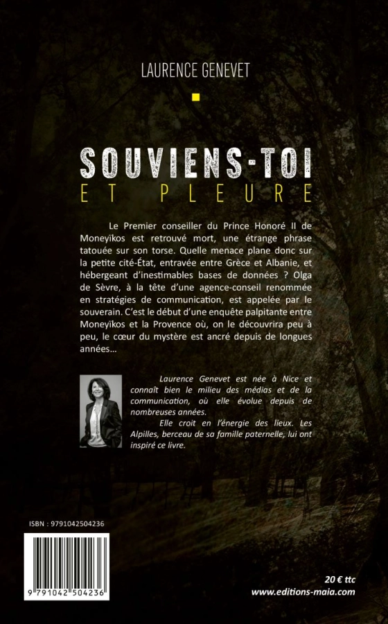 Le Premier conseiller du Prince Honoré II de Moneyïkos est retrouvé mort, une étrange phrase tatouée sur son torse. Quelle menace plane donc sur la petite cité-État, entravée entre Grèce et Albanie, et hébergeant d’inestimables bases de données ? Olga de Sèvre, à la tête d’une agence-conseil renommée en stratégies de communication, est appelée par le souverain. C’est le début d’une enquête palpitante entre Moneyïkos et la Provence où, on le découvrira peu à peu, le cœur du mystère est ancré depuis de longues années…
