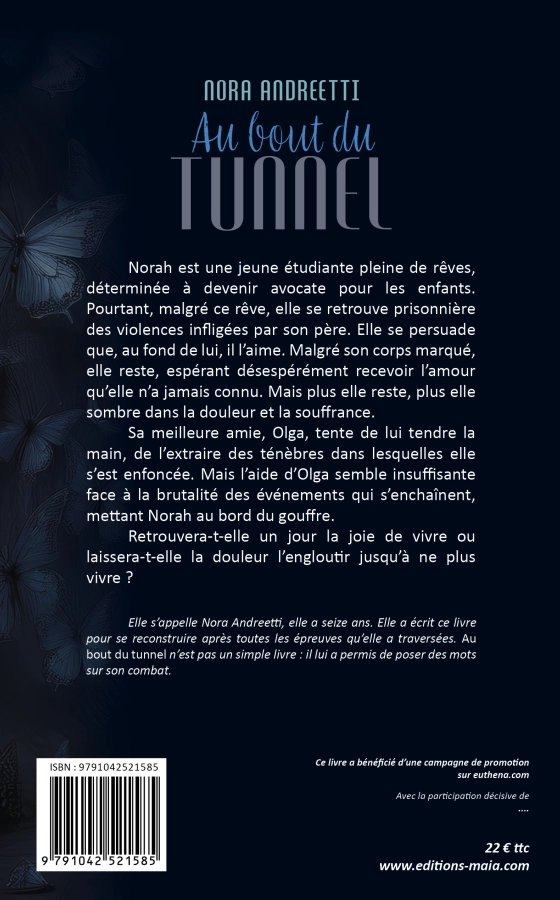 Je m’appelle Nora Andreetti, j’ai 16 ans et j’ai écrit ce livre qui m’a permis de remonter à la surface quand je me noyais dans les ténèbres de ma vie.