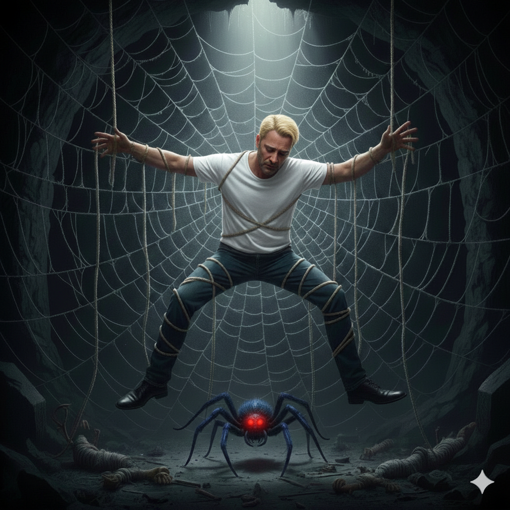 L'araignée bleue marine explique l'envers du décor, la machination, les rouages et la chute vers le néant.