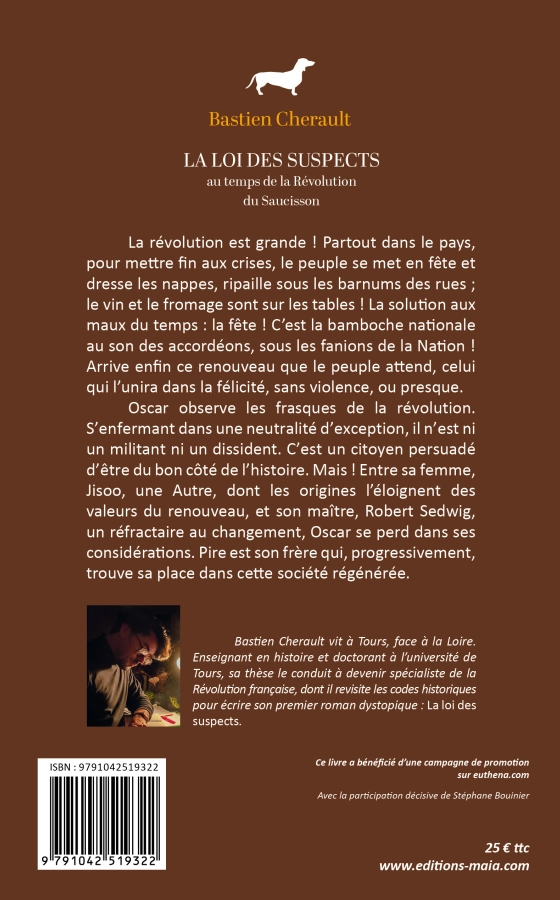 Bastien Cherault, doctorant en Histoire à l’Université de Tours, est enseignant à la faculté et en lycée. Spécialiste de la vie catholique au XVIIIe siècle et de la Révolution française, ce jeune historien explore d’autres voies, comme l’écriture, pour partager et transmettre son regard sur la contemporanéité. La Loi des Suspects est son premier roman publié, un récit à la fois sincère, intime et complètement absurde.