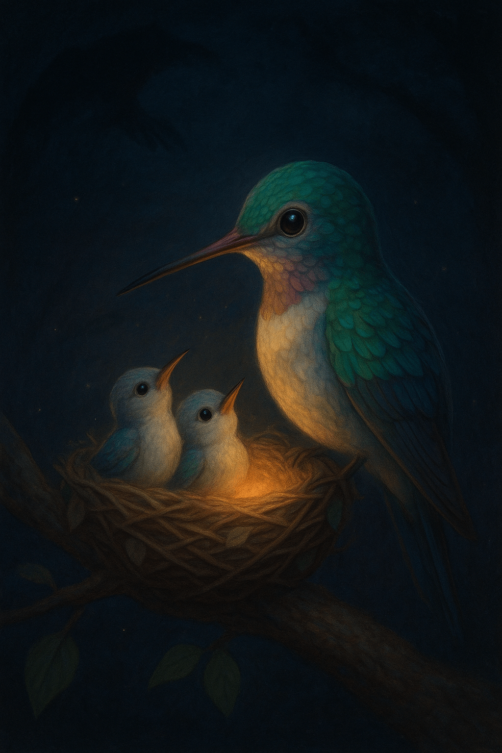 Petite, vive, le cœur grand comme un monde. Avec elle, deux oisillons : Lumi et Sol, deux éclats de rire aux ailes tremblantes. Chaque matin, ils volaient ensemble entre les fleurs, goûtaient le miel du soleil et se racontaient des histoires suspendus aux branches. Ils étaient un nid, un chant, un éclat de vie.
