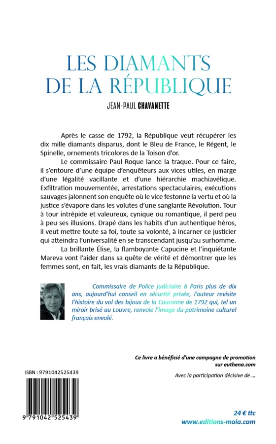 Commissaire de Police Judiciaire sur les Champs Elysées plus de dix ans, aujourd’hui Conseil en sécurité privée à Paris, j’ai écrit un premier roman historique intitulé « les Diamants de la Révolution » qui revisite le casse du millénaire commis à Paris, place la Concorde, en 1792.