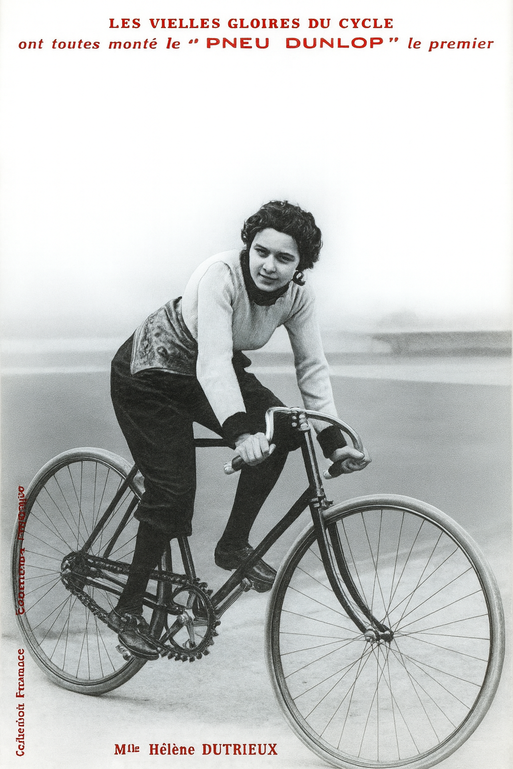 « Le nom de Mlle Hélène Dutrieu est célèbre à Paris depuis la soirée d’hier à l’Olympia. On ne saurait pousser aussi loin l’héroïsme, ou plutôt la folie du sport, que cette frêle jeune femme qui vient de nous faire oublier le looping the loop et tous les exercices de ce genre, où l’on se joue du danger et de la mort. La salle était haletante de terreur et d’enthousiasme lorsqu’elle a vu Mlle Hélène Dutrieu dévaler avec une rapidité foudroyante sur sa bicyclette, la piste presque droite, s’élever en l’air par un bond fantastique, et franchissant un espace vide de dix-huit mètres avec la trajectoire, retomber enfin sur l’autre piste. C’est du prodige, du rêve. L’artiste est sûre d’elle-même ; on admire la précision et l’élégance de la courbe qu’elle fait décrire à sa monture d’acier. Cela ne semble pas réel ni possible, et cependant cela est. Rien n’est plus gracieux qu’une telle intrépidité ; dans sa façon d’affronter si coquettement un péril effroyable, Mlle Dutrieu reste femme. Et l’on songe, en la voyant passer dans l’espace au-dessus de nos têtes, à la chevauchée aérienne des Walkyries.