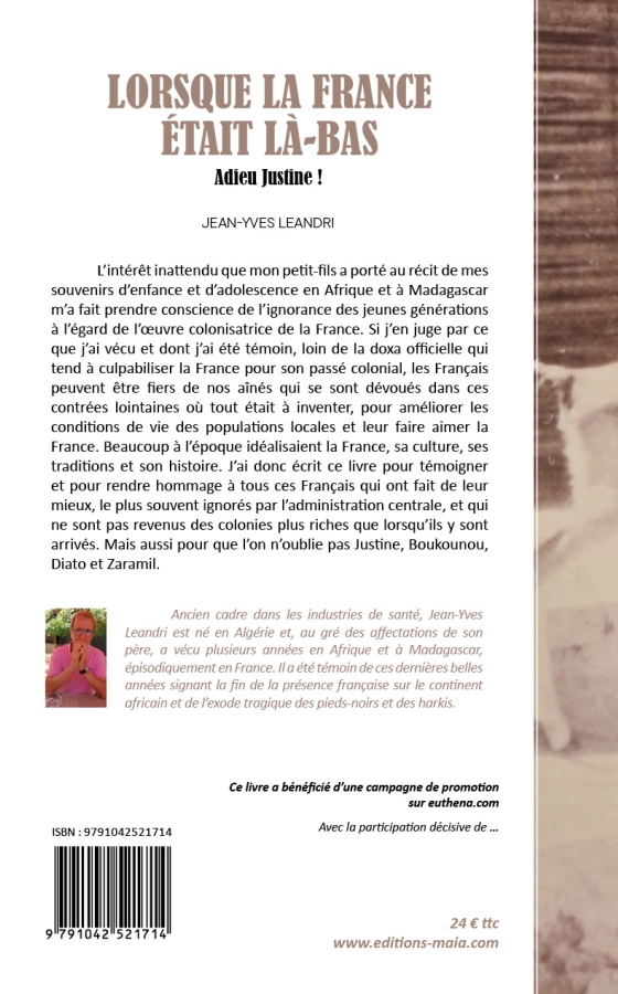 J’ai donc écrit ce livre pour témoigner et pour rendre hommage à mes aînés qui ont fait de leur mieux dans ces contrées où tout était à inventer, parfois sans moyens, et qui n’en sont pas revenus plus riches que lorsqu’ils sont arrivés. Mais aussi pour que l’on n’oublie pas Justine, Boukounou et Zaramil…