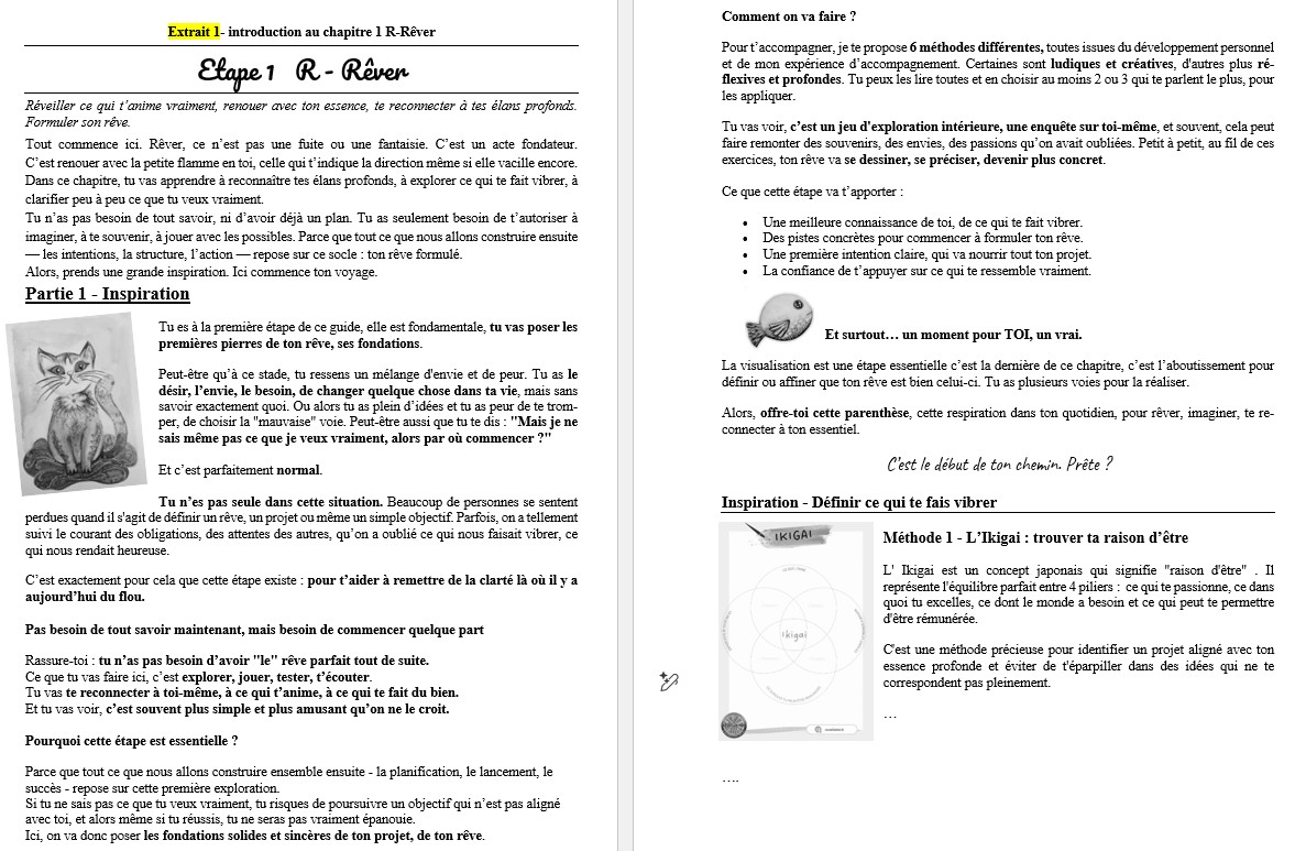 RÉVEILLE-TOI ! te guide pas à pas grâce à R.E.V.E.I.L.®, une méthode illustrée en 6 étapes, nourrie de rituels d’Ixchel et d’outils concrets (méthode d’organisation, prompts d’IA, QR codes).