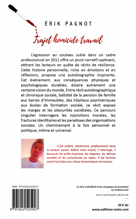 Ce livre écrit dans l’urgence et l’inquiétude vous parlera d’une agression au couteau. Comment passer de l’arme blanche à l’âme blanche. Beaucoup ont des réponses intuitives et expéditives pour vous envoyer sur le chemin en vogue de la résilience. De quoi guérit-on, de quoi nous sauvons nous ? Les chemins intérieurs sont instables et labyrinthiques et méritent d’être explorés sans complaisance pour faire peut-être jaillir non pas une lumière mais des ressources minimums pour continuer un bout de vie. Tout ce qui blesse reste, détruit ou anime, rend volontaire ou impuissant, tour à tour stratège, lâche, abandonnique mais viscéralement et tristement humain. Les fabriques de victimes sociales sont tout aussi considérables que cette tragédie personnelle, ainsi chacun qui me lira découvrira une construction personnelle aussi renforcée que déformée par l’épreuve de la vie et les confrontations sociales. Si vous me lisez, c’est que vous voulez rester ou devenir un peu plus libres et même parfois mal pensants. Prenez le risque !