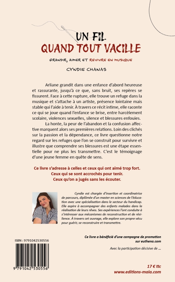 Le projet « Un fil quand tout vacille » est un récit autobiographique qui explore le parcours de reconstruction d’une jeune femme confrontée à des violences, au harcèlement scolaire et à de multiples épreuves familiales. À travers l’histoire d’Arliane, l’autrice montre comment un enfant peut grandir avec des traumatismes invisibles et apprendre à survivre dans le silence. Le livre aborde des thèmes sensibles comme l’inceste, la honte, l’harcèlement scolaire et la phobie sociale qui en découle, la difficulté de parler de ce que l’on a vécu et la sensation permanente de vivre avec un sentiment d’abandon. Il met également en lumière le rôle essentiel de certains refuges émotionnels, notamment la musique à travers un chanteur, qui devient un soutien pour traverser les périodes les plus sombres. Le récit souligne l’importance des liens humains, des rencontres et parfois, de la solidarité entre personnes partageant des expériences similaires. Il montre comment l’expression, l’écriture et la parole peuvent devenir des outils de guérison. Ce projet vise à briser les tabous autour des violences et des traumatismes, tout en donnant de l’espoir aux personnes qui se sentent seules dans leurs difficultés. Il invite à changer le regard porté sur les mécanismes de survie et sur l’attachement à des figures artistiques. L’objectif est de sensibiliser, de libérer la parole et d’offrir un message de résilience.