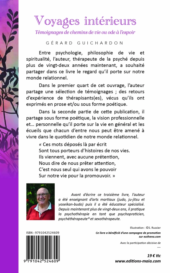 Dans ce livre, j'ai souhaité partager le regard particulier que je porte sur notre monde relationnel. J'y "navigue" entre... psychologie, philosophie de vie et spiritualité. Dans le premier quart de cet ouvrage, je partage une sélection de témoignages, des retours d'expériences de thérapisants(es)... de leurs vécus sur la thérapie, exprimés en prose ou sous forme poétique. Dans les trois autres quarts je partage, sous forme poétique, la vision professionnelle et... personnelle que je porte sur la vie en général, et sur les écueils que chacun d'entre nous peut être amené à vivre dans le quotidien de notre monde relationnel.