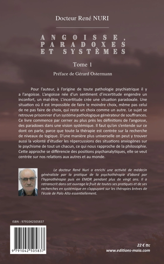 Pour l’auteur, à l’origine de toute pathologie psychiatrique il y a l’angoisse. L’angoisse née d’un sentiment d’incertitude engendre un inconfort, un mal-être. L’incertitude crée une situation paradoxale. Une situation où il est impossible de faire le moindre choix, même pas celui de ne pas faire de choix, qui reste un choix comme un autre. Le sujet se retrouve prisonnier d’un système pathologique générateur de souffrances. Ce livre commence par cerner au plus près les définitions de l’angoisse, des paradoxes dans une vision systémique. Il faut qu’on s’entende sur ce dont on parle, parce que toute la thérapie est centrée sur la recherche de niveaux de logique. D’une manière plus universelle on peut y trouver aussi la volonté d’étudier les répercussions des situations anxiogènes sur le psychisme de tout un chacun, ce qui nous rapproche de la philosophie. Cette approche se différencie des positions psychanalytiques, elle se veut centrée sur nos relations aux autres et au monde.