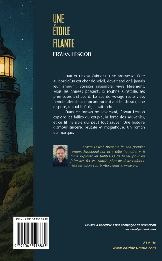 Dan et Chana s’aiment. Une promesse, faite au bord d’un coucher de soleil, devait sceller à jamais leur amour : voyager ensemble, vivre librement. Mais les années passent, la routine s’installe, les promesses s’effacent. Le sac de voyage reste vide, témoin silencieux d’un amour qui vacille. Un soir, une dispute, un oubli. Puis, l’inattendu. Dans ce roman bouleversant, Erwan Lescob explore les failles du couple, la force des souvenirs, et ce fil invisible qui peut tout sauver. Une histoire d’amour sincère, brutale et magnifique. Un roman qui marque.