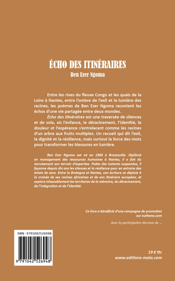 Écho des itinéraires est un recueil de poésie qui interroge l’identité, l’exil et la résilience à travers une traversée intime entre le Congo-Brazzaville et la France. Sa singularité réside dans la rencontre entre une histoire personnelle et des résonances universelles, où chacun peut retrouver un fragment de soi. Soutenir ce projet, c’est accompagner la naissance d’une voix singulière émergente qui relie les mémoires individuelles aux grands mouvements de notre temps. Le recueil s’adresse aux passionnés de poésie autant qu’à celles et ceux qui questionnent leur propre chemin, leur appartenance ou leurs racines. Inspiré par la tradition orale, la poésie contemporaine et les écritures du déracinement, ce livre aspire à devenir un pont entre les terres, les êtres et les voix.