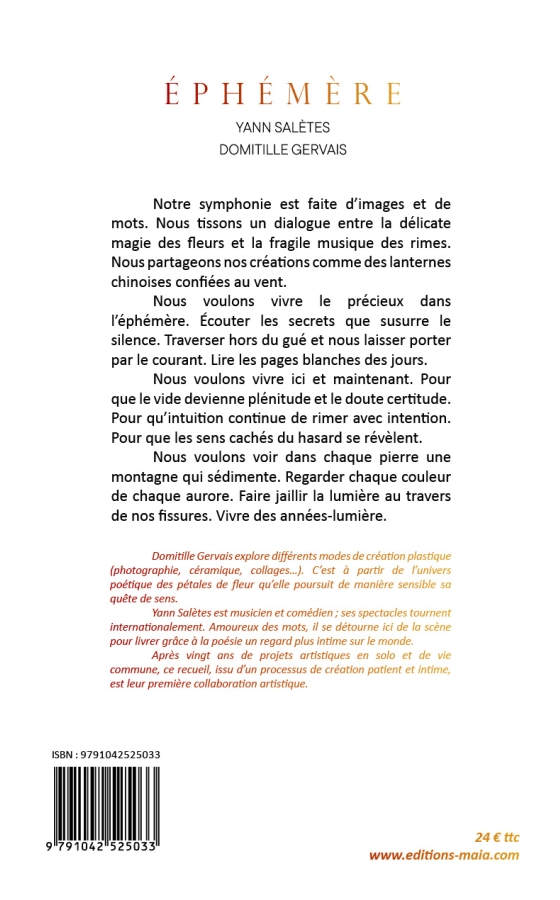 « Notre symphonie est faite d’images et de mots. Nous tissons un dialogue entre la délicate magie des fleurs et la fragile musique des rimes. Nous partageons nos créations comme des lanternes chinoises confiées au vent.