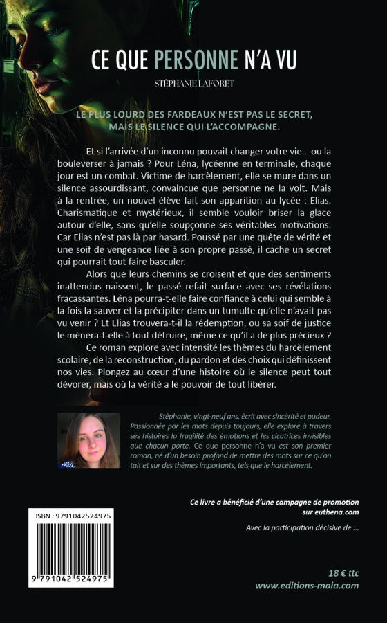Ce que personne n’a vu explore le croisement de deux solitudes : celle de Léna, une adolescente rendue invisible par le harcèlement, et celle d’Élias, un garçon venu pour se venger d’un passé qu’il ne comprend plus.