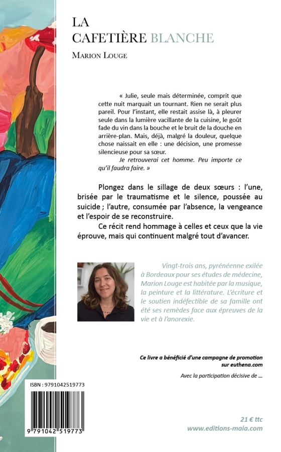 La cafetière blanche est un thriller grave et lumineux qui explore le deuil sous ses aspects les plus âpres : colère, incompréhension, besoin de justice. Marion Louge plonge le lecteur dans le sillage de deux sœurs : l’une, brisée par le traumatisme et le silence, poussée au suicide ; l’autre, consumée par l’absence, la vengeance et l’espoir de se reconstruire. Avec honnêteté et sans détour, l’autrice aborde des questions essentielles — le consentement, le viol et le suicide — offrant une voix à tous ceux qui n’en ont pas toujours eu. Ce roman est né d’un désir viscéral de vengeance et d’une quête de sens après l’impensable.