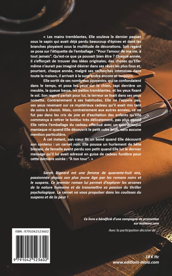 A cet instant, son cœur fit un bond quand Elle découvrit sont contenu : un carnet noir. Elle poussa un hurlement de bête blessée, de femelle ayant perdu son petit quand Elle lut le dernier message qu’il lui avait adressé en guise de cadeau funèbre pour cette dernière soirée : « A ton tour ».