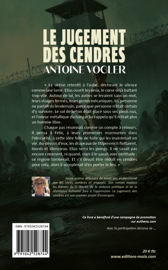 Antoine Vogler, jeune auteur débutant de treize ans et passionné par les récits sombres et engagés. J’écris pour explorer les thèmes de la liberté, de la violence politique et de la résistance humaine face à l’oppression. Le Jugement des Cendres est mon premier roman d’envergure.