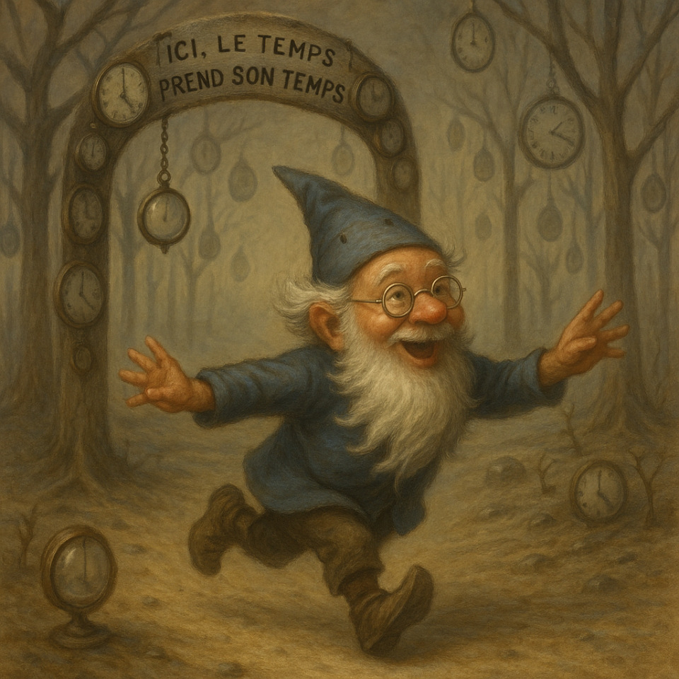 C'est alors qu’il le vit. Un petit vieillard, pas plus haut qu’un genou, courait en rond autour d’un tronc, les bras tendus comme un enfant qui joue à l’avion. Il avait une barbe de neige, des lunettes sans verres, et un chapeau pointu troué au sommet. Il riait. Un rire cristallin, pur, presque trop fort pour ce silence ancien.