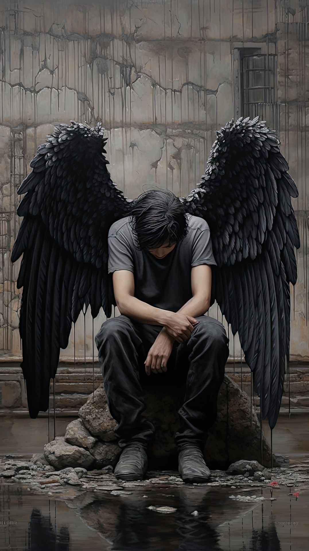 Il se retrouva lui aussi dans une clairière, mais complètement nu. Son corps d’albâtre scintillait dans la nuit étoilée. Il était là un genou à terre, la tête penchée vers le sol, un poing posé sur la mousse de la clairière. Ses ailes étaient déployées dans son dos. Il ne lui fallut que quelques instants pour reprendre ses esprits et se relever. Il pencha légèrement la tête sur le côté. Le vent léger faisait bouger ses cheveux noirs et ses ailes qu’il fit disparaitre aussitôt. Il ne ressentait aucunement le froid mais il savait qu’il devait se couvrir, même si la nudité ne le dérangeait pas.