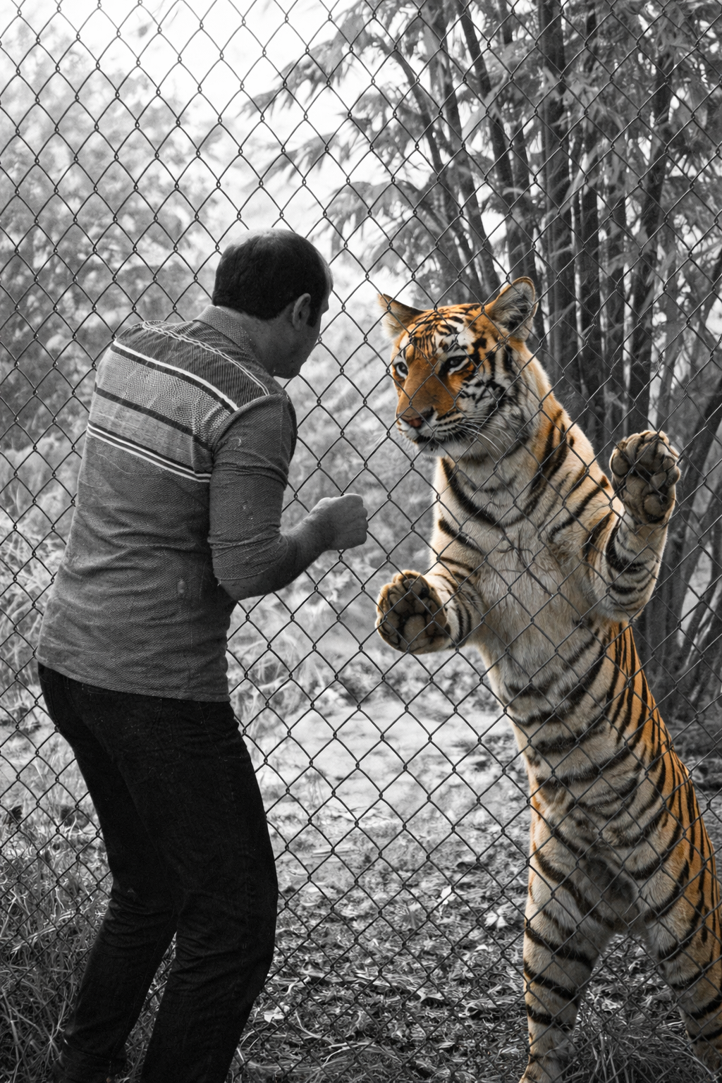 C’était le territoire de Khan un autre tigre énorme et cruel qui allait défendre ses frontières. Son choix se restreignait entre deux morts. Il choisit de mourir sous la dents de Khan et se laissa glisser à l'eau.Faible il nageait lentement. Heureusement à cet endroit le courant n'était pas fort et le fleuve un peu plus étroit qu'ailleurs. En prenant pied sur la rive il réussit à aller se cacher sous les branches. Là il perdit connaissance. Ce que le tigre ignorait c'est que Khan l'avait observé depuis bien longtemps et l'avait laisser agir. Ces animaux sont invisibles mais connaissent tout de leur domaine. Combien de gens se sont promenés dans les abords luxuriants des fleuves d'Asie et prétendant justement n'avoir pas vu grand chose si ce n'est rien. Ils ignorent qu'ils ont été observés en permanence. Souvent ils sont passés près d'un tigre ou d'une panthère qui les a laissés vivre. Enfin Khan était un vrai tigre qui connaissait bien son domaine et disons qu'il ressentit une sorte de compassion pour le tigre blessé. Bien sûr, il est difficile d'attribuer des sentiments humains à des animaux, surtout quand il s'agit de grands prédateurs, mais je ne vois pas d'autres explications.