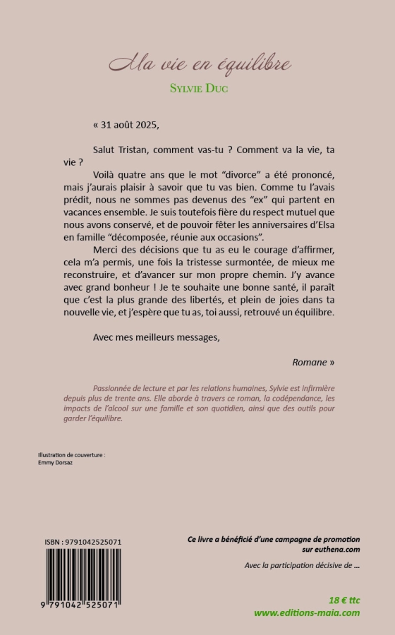 Ce roman relate les émotions et le vécu de Romane, auprès de son mari qui souffre d’une dépendance à l’alcool. Il aborde le témoignage d’une vie de femme adulte, la grossesse, la famille, les décisions, la codépendance, l’amour… Partager ce récit, c’est découvrir un parcours de vie qui pourrait être le vôtre, ou pas. Découvrir une partie de ce monde de la dépendance sous un autre regard, c’est, peut-être, se questionner sur son propre rapport au couple, à sa vie, à ses choix…