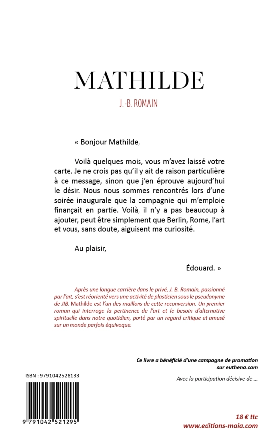 Passionné autant qu’intrigué par l’histoire de l’art, avec une prédilection pour les périodes modernes et contemporaines, j’ai toujours cherché à comprendre le rôle, le sens et la place de l’art dans notre société. Poussé par la volonté de m’investir plus encore, j’ai entrepris la rédaction de Mathilde, premier maillon de cette réflexion, qui s’inscrit dans une démarche plus vaste, vers un travail de plasticien. Je vous invite à devenir acteur de la naissance de mon livre et à m’aider à en faire un succès avec les Éditions Maïa. Plus les préventes seront nombreuses, plus le livre sera promu et diffusé.