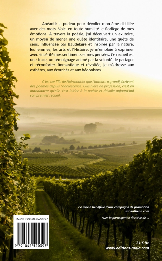 Je vous propose d'être acteur de la naissance de mon livre en m'aidant à faire de sa parution prochaine, avec les Editions Maïa, un succès. Plus les préventes seront nombreuses, plus mon livre sera promu et diffusé. En retour, vous serez présents dans le livre en page de remerciements et vous recevrez le livre en avant-première, frais de port inclus en France (doms/toms inclus) ! Merci de votre soutien dans la réalisation de ce beau projet.