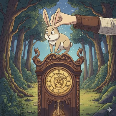 “Mouais…” grogna un homme barbu au fond de la pièce, dont le pull tricoté représentait une carpe géante. Pour moi ça n’a pas trop de sens cette histoire… Mais enfin, chacun voit midi à sa porte, hein”. A peine eut-il prononçé ces mots qu’un BONG sourd résonna dans la taverne. La vibration fit trembler les verres et sursauter un chat noir qui dormait près de la cheminée. Tous les regards se tournèrent vers la porte d’entrée, où une gigantesque horloge ancienne venait d’apparaître, clouée au bois comme si elle avait toujours été là. Son bois sombre était gravé de symboles étranges et son balancier se mit à osciller frénétiquement, comme pris de panique. elle sonna alors douze coups de midi, assourdissants DONG DONG DONG